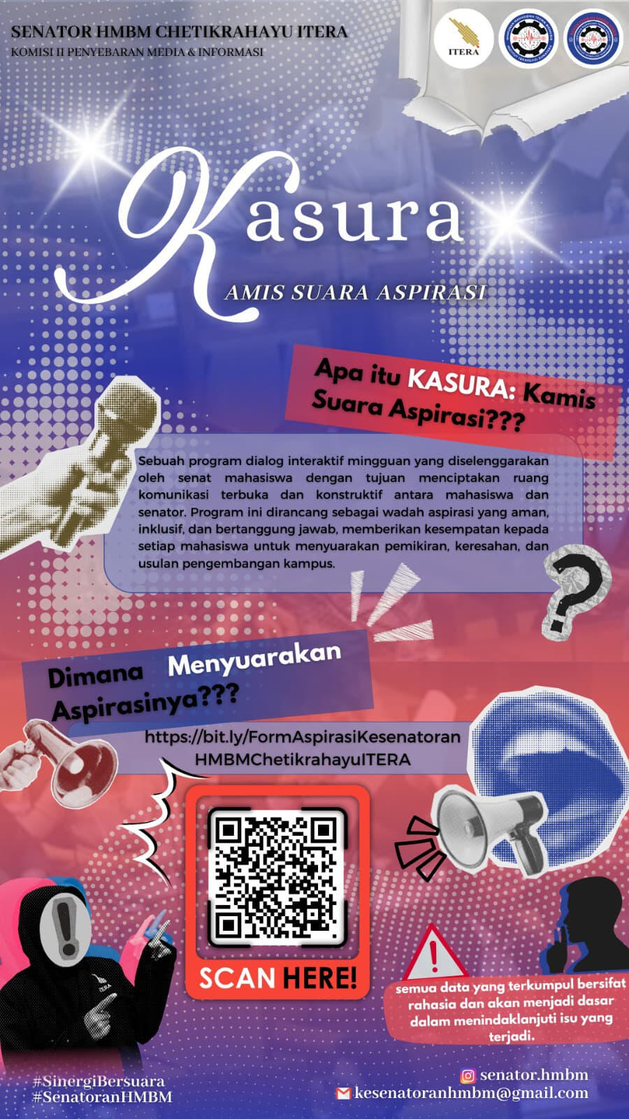 Program dialog interaktif mingguan yang diselenggarakan oleh senator dengan tujuan menciptakan ruang komunikasi terbuka dan konstruktif antara mahasiswa dan senator. Program ini dirancang sebagai wadah aplikasi yang aman, inklusif, dan bertanggung jawab, memberikan kesempatan kepada setiap mahasiswa untuk menyuarakan pemikiran, keresahan, dan usulan pengembangan kampus.